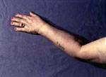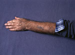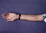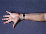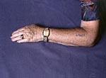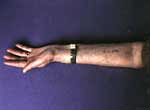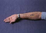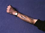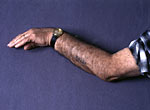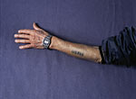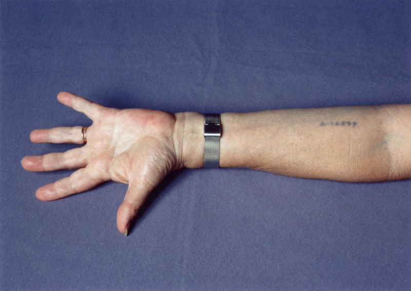 In dem umfangreichen Werk Zähler = Nenner, 1995/97 erfasst Beate Passow tätowierte Unterarme von Menschen, die Gefangene des ehemaligen Konzentrationslager Auschwitz waren. Die Gezählten sind namenlos. Sie leben heute in vielen Ländern Europas und in Israel. Es sind alt gewordene Menschen, die ihre Arme und Hände zeigen. Alles Individuelle des Menschen, seine Lebendigkeit und seine Hilflosigkeit wie seine Stärke offenbaren sich hier. Es sind Menschen, die überlebten und die allein durch Ihre Existenz zu uns sprechen. Sie sagen durch ihre Bezeichnung, was mit ihnen geschehen ist: einst zu zählbarem Material reduziert und mit diesem Menetekel behaftet sind sie durchs Leben gegangen. Sie sagen uns, da? sie Menschen sind wie alle anderen auch, die individuell verschieden sind, sich schmücken und die alt und gebrechlich werden, wenn sich das Leben neigt. Beate Passow hat für diese Arbeit die betroffenen Menschen aufgespürt, sie befragt und um die Erlaubnis für die Aufnahme gebeten. Sichtbar werden uns allein die ausgebreiteten Arme, im Querformat mehr oder weniger mittig aufgenommen, die Wendung des Armes so, daß jeweils die Tätowierung sichtbar ist. In der zahlreichen Aneinanderreihung von 40 Aufnahmen wird so der gemeinsame Nenner ablesbar. Dieser Nenner führt uns auf den Grund der Entmenschlichung: unmittelbarer noch als im Judenstern wird der Zwang, die Unterdrückung und Mechanisierung anschaulich gemacht, die selbst vor dem Menschen nicht einhielt. Das, was wir hier schauen können, vermittelt etwas vom Unglaublichsten. Der ersten Betroffenheit folgt eine Sprachlosigkeit. Es gibt eigentlich nicht mehr zu sagen als; Seht euch das an.