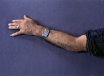 Und doch: in der Reihung, immer vor dem gleichen blaugrauen Karton, entsteht einerseits Vergleichbarkeit der manchmal hilflos wirkenden, gereckten Arme, andererseits werden sie für die Betrachtung nochmals einem starren Raster unterworfen, das durchaus auch als zwanghaft empfunden werden kann. Aus dem Einzelfall entsteht so die aufs Allgemeine zielende Aussage.
