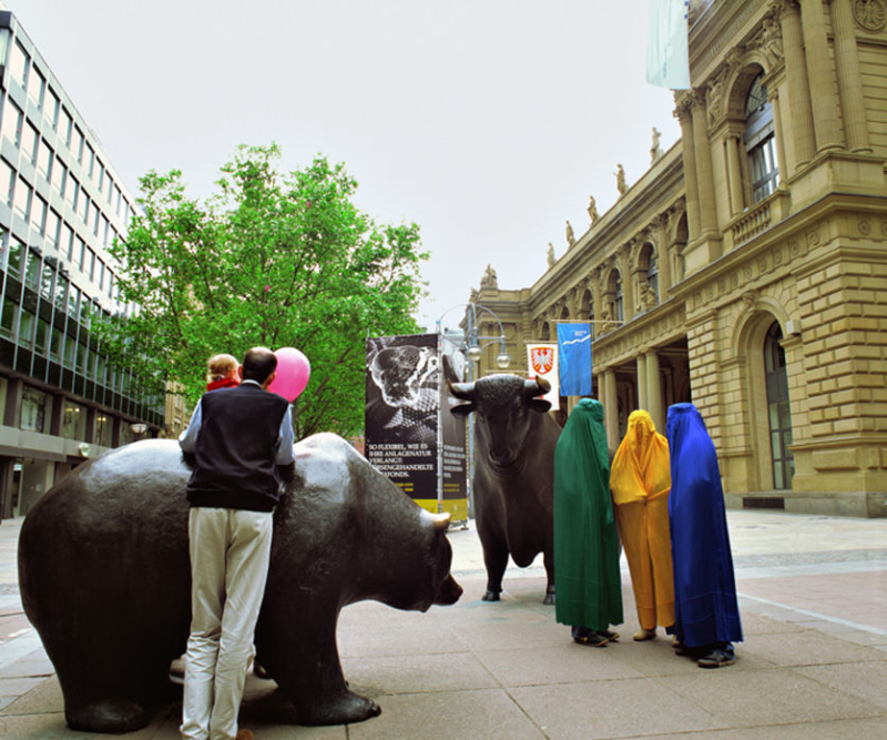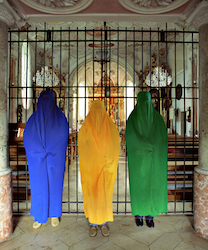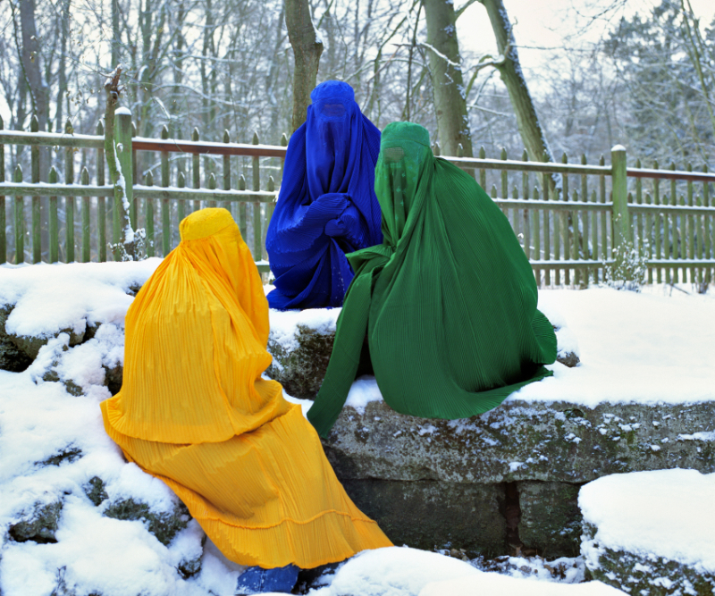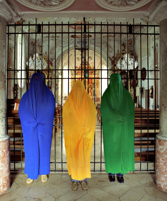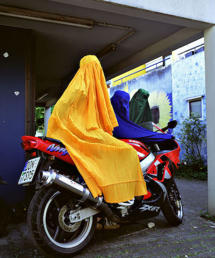 Wer Beate Passow und ihre Arbeit etwas näher kennenlernt, weiß, daß in ihrem Humor viel Ernst und vor allem eine höchst sensible politische und soziale Haltung steckt. Beate Passow ist eine politische Künstlerin – aber keine Künstlerin der politischen Parolen und einfachen Bekenntnisse. Dazu ist sie zu subtil. Das machen schon die beiden gegenläufigen Reaktionen deutlich, die sie gerade mit den Fotos der Burka-Trägerinnen bei uns auslöst: Befremden und Erheiterung, Sorge und Lachen. Und wenn Sie den Titel der Serie lesen, dann bleiben die Gefühle weiter ambivalent: "Mode und Bewußtsein" heißen die Fotos. Sich bunte Burkas als Mode, vielleicht als letzten Schrei einer multikulturell aufgeschlossenen Jugendkultur vorzustellen, läßt uns wieder schmunzeln – aber die Vokabel "Bewußtsein" erinnert daran, daß diejenigen, die Burkas tragen, das nicht tun, weil es modisch ist, sondern weil sie damit eine Gesinnung – eben ein religiöses Bewußtsein – zum Ausdruck bringen wollen – oder müssen. Und schon ist es mit der Heiterkeit wieder vorbei, und man denkt ebenso besorgt an die Unterdrückung der Frauen im Islam wie an fundamentalistische Tendenzen, die hier im Westen häufig, sicher zu Unrecht, mit der Verschleierung gleichgesetzt werden. Was man einerseits also als farbenfrohe Abwechslung, als bunt und bereichernd empfindet, weckt anderseits Mißtrauen – und Zweifel, ob wir nicht manchmal zu leichtfertig mit unserer Freiheit umgehen, ja ob wir uns nicht vielleicht etwas zu naiv für kulturelle Vielfalt begeistern.