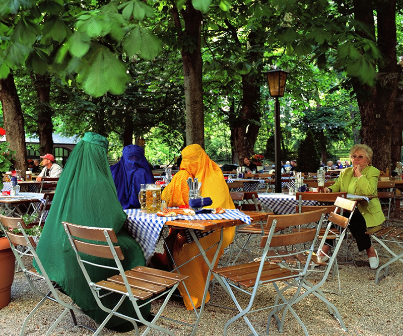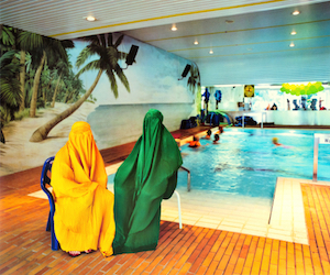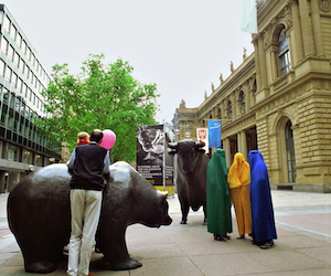 Meine sehr geehrten Damen und Herren, "Inshallah" ruft Beate Passow uns mit dem Titel ihrer Ausstellung entgegen: Wenn es Allah, wenn es Gott beliebt. Und in die Welt des Islam versetzt uns nicht nur dieser Titel, sondern auch eine Reihe von Bildern, die Sie hier sehen können – und die heute zum Teil zum ersten Mal überhaupt gezeigt werden. Natürlich fallen die Fotos mit den farbkräftigen Burkas zuerst auf (sie sind eigens für diese Ausstellung entstanden): Jeweils ein, zwei oder drei Personen haben sich ganz verschleiert, so daß man nichts mehr von ihnen erkennen kann. Bei den meisten ist nicht einmal zu sehen, ob Männer oder Frauen unter der Burka stecken – doch da man bei Burkas gleich an den Islam denkt, nimmt man auch fraglos an, daß es sich um Frauen handeln muß. Beate Passow hat die Burkaträgerinnen aber nicht etwa in Riad, Teheran oder Tripolis fotografiert, sondern in Deutschland – vor der Frankfurter Börse, auf einem Motorrad mit Donauwörther-Kennzeichen, in einem bayerischen Biergarten. Sollte es also schon so weit gekommen sein, mag mancher befremdet, vielleicht auch besorgt fragen, daß man auch hier in Deutschland überall so offensichtliche Zeichen islamischer Kultur wiederfinden kann? Hat sich bei uns, im christlichen Abendland, gar bereits die von manchen Medien und Politikern prophezeite islamische Parallelgesellschaft etabliert? (Manche von Ihnen denken vielleicht auch an die Ausstellung von Bruno Wank im letzten Jahr, als das Künstlerhaus Marktoberdorf ja bereits einen sechzehn Meter hohen Turm verliehen bekam, der wie ein Minarett erschien – und als damit ebenfalls Formen aus der islamischen Welt plötzlich ganz präsent wurden.) Aber damit kein falscher Verdacht aufkommt: Es braucht nicht verheimlicht werden, daß Beate Passow diese Fotos eigens inszeniert hat. Es würde wohl doch zu lange dauern, bis man in einem Fitneßstudio auf zwei Burkaträgerinnen träfe, die man fotografieren kann. Und daß eine davon dann auch noch rot lackierte Fußnägel hat, erscheint erst recht unwahrscheinlich. Mit solchen Details gibt die Künstlerin sogar einen klaren Hinweis auf den inszenierten Charakter dieser Bilderserie. Und sobald man das bemerkt, ändert sich auch die Reaktion auf die Fotos. Man genießt die Situationskomik, die in ihnen liegt, stellt sich z. B. vor, wie die Biergartenbesucher mit dem Kontrast umgegangen sind, der durch die Burkaträgerinnen entstanden ist. Schließlich kann man über die Bilder sogar richtig lachen, das verhohlene oder ganz konkrete Befremden, das man zuerst verspürte, tritt in den Hintergrund. Aber – so mag man vielleicht fragen – zeigt uns Beate Passow dann nicht einfach ein faschingähnliches Verkleidungsspiel? Und dürfen über so schwere Themen wie Religionen, ja über kulturelle Differenzen überhaupt Witze gemacht werden? Wird der oft beschworene "Kampf der Kulturen" damit nicht zu leicht, zu humorvoll genommen?