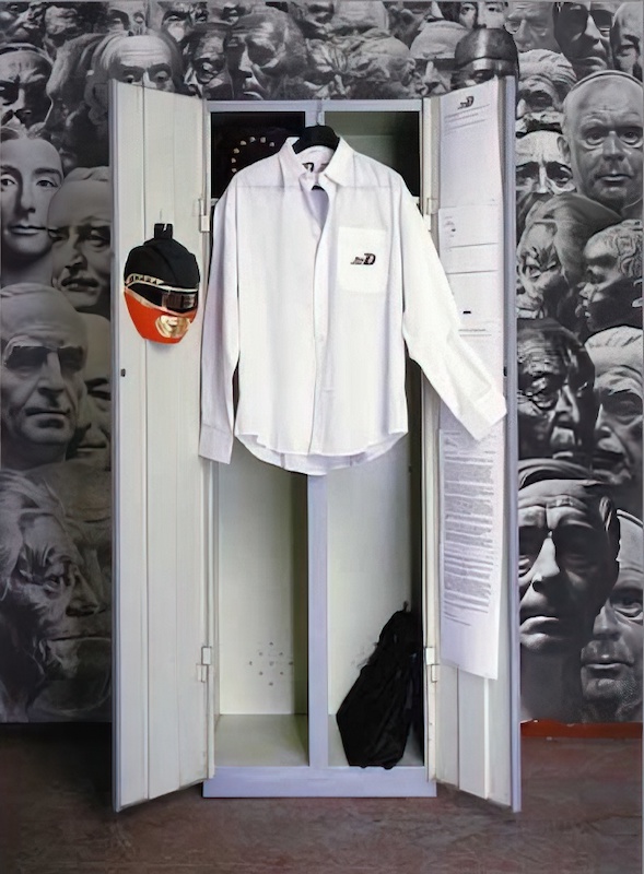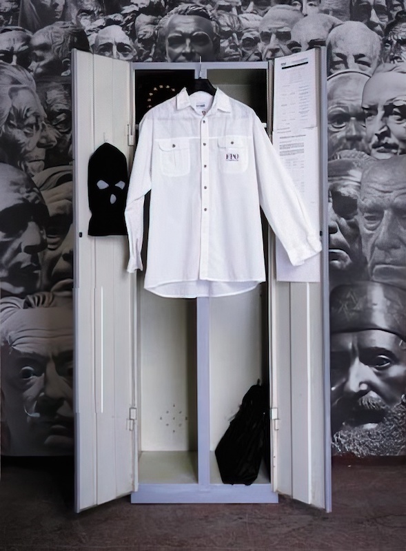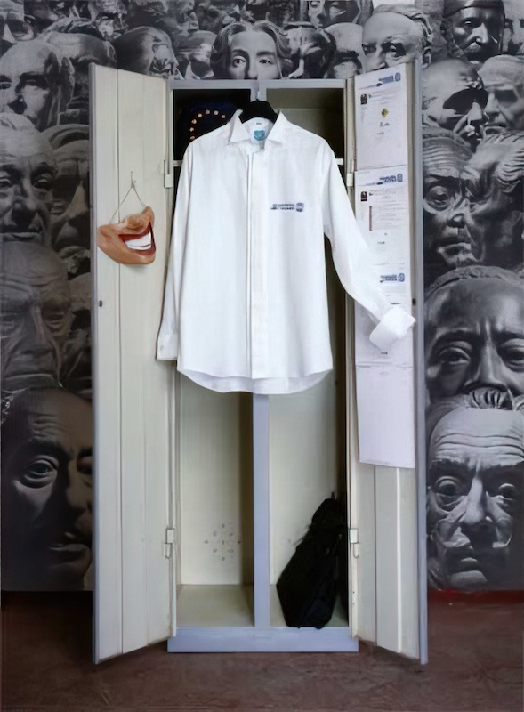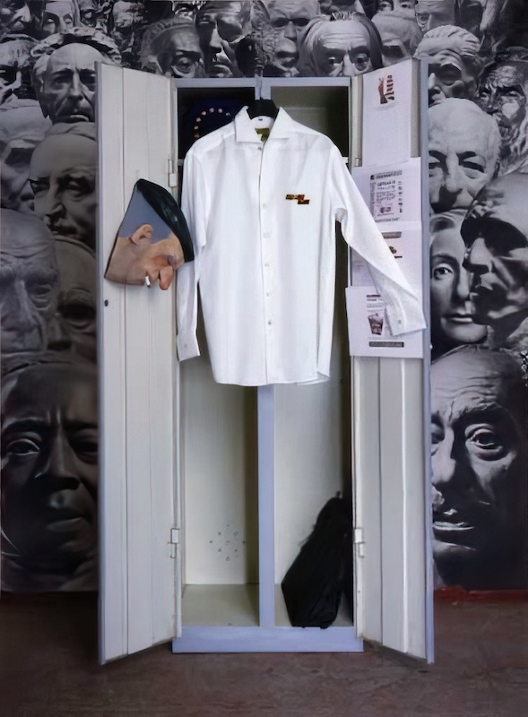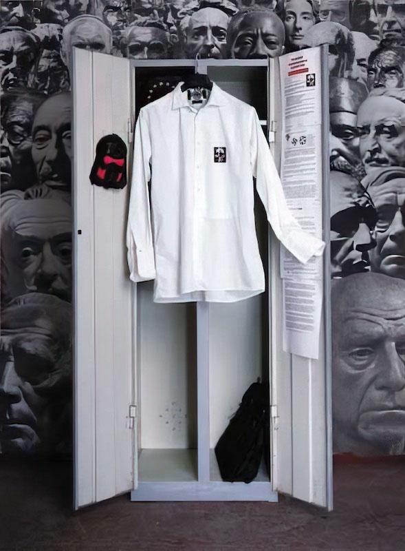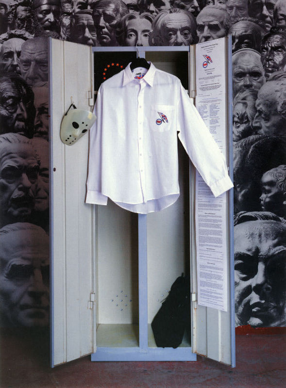 Mit keinem der im Spind angebrachten Gegenstände sind die Hintergrundsköpfe so eng verbunden wie mit den Masken, die offenlegen, was sich hinter den Portraitköpfen verbirgt: martialische Glätte, grinsende Schadenfreude und finstere Rachsucht, die, scharfe Zähne zeigend, in satanisches Gelächter übergehen kann. Die Macht zeigt in den Masken ihr wahres Gesicht. Zugleich gehören die Masken zu den Requisiten des Spindes, der, geöffnet, sein Inneres offenlegt. Bilden die von dem 1991 neunzigjährig verstorbenen Arno Breker gefertigten Köpfe den Hintergrund, auch historisch gesehen, so erweist sich das Innere des Spindes als gegenwärtig: Gewaltbereitschaft in zeitgemässem Outfit. Kommunikationstechnisch auf dem neuesten Stand, werben heute die rechtsradikalen Parteien via Internet für ihre nationalistischen Ideen, beschwören die Gefahr der Überfremdung, der Vereinnahmung durch „Europa", schüren so den Ausländerhass und fördern die Bereitschaft zur Gewalt gegen Fremde und gesellschaftliche Randgruppen. Die Westen derer, die die Homepage für Parteien wie die FPÖ, die British National Party, Front National, Alleanza Nazionale, Falange Española und andere entwerfen, bleiben rein wie die frisch gestärkten und gebügelten weißen, in der Bildmitte ausgehängten Hemden mit ihren zu den ausgedruckten Internetseiten hin ausgestreckten Hemdsärmeln. Die Schläger, die Skinheads auf der Strasse, sind andere. Das Europazeichen, die einen Kreis bildenden Goldsterne, macht darauf aufmerksam, dass rechtsradikale Parteien europaweit verbreitet und miteinander verbunden sind, dass sie, trotz ihrer Vorbehalte gegenüber „Europa", die sich zur Hetze steigern können, doch gerade auch an der in übernationalen Institutionen und Wirtschaftsunternehmen konzentrierten Macht partizipieren. Der Europagedanke bietet als solcher in der politisch-gesellschaftlichen Gegenwart keinen Schutz gegen Nationalismen und ihre Funktionalisierung zum Gewinn und zum Erhalt der Macht. Was in der schwarzen Aktentasche transportiert werden soll, kann man sich denken.