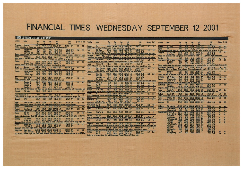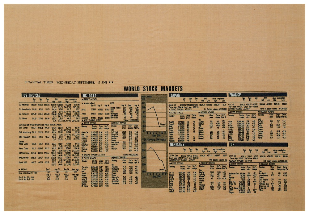 Größe: je 110 cm x 120 cm Material: auf rosa Rohseide gestickte Seite der Aktienkurse der Financial Times vom 12. September 2001, gerahmt