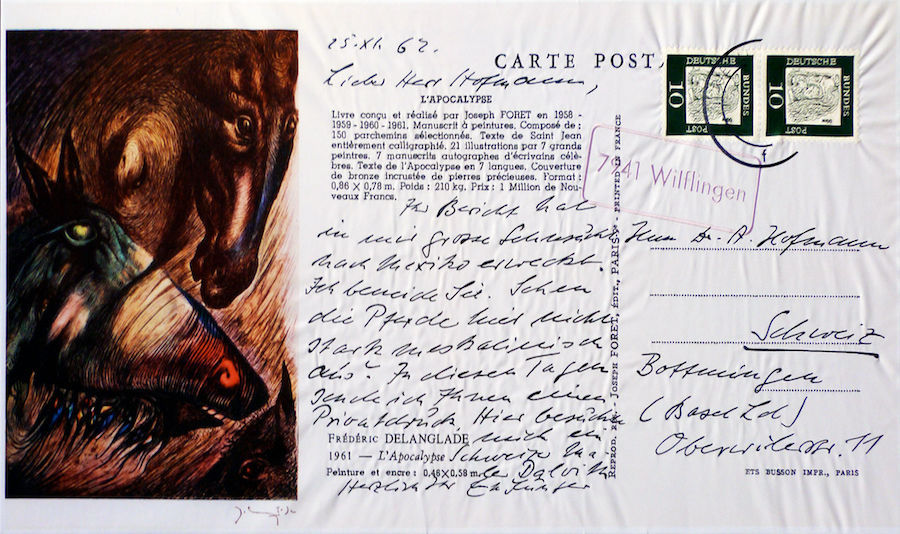 L'Apocalypse, Postkarte vom 25.11.1962, Ernst Jünger an Dr. Albert Hofmann Foto und Stickerei auf Stoff, 74 x 140 cm, 2015