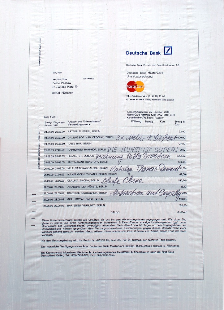 Beate Passow ließ die Kontoauszüge sticken – und verwandelte so nüchterne Angaben über das Leben im Kunstbetrieb in eine eigene künstlerische Arbeit. Kleinteiligkeit und Sorgfalt der Stickerei verleiten dazu, auf Details zu achten und Zahlen und Daten viel länger zu studieren, als das sonst üblich wäre. Das große Format der Stickereien – unter dem Titel Trade-Made – sorgt zudem für einen monumentalen Charakter. Man denkt an die mittelalterliche Tradition, bedeutende historische Ereignisse als Teppiche sticken zu lassen, ja als Herrscher die eigene Macht in dieser aufwendigen Technik in Szene zu setzen. Der Teppich von Bayeux ist dafür nur das prominenteste Beispiel.
