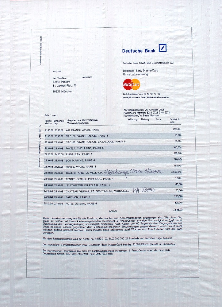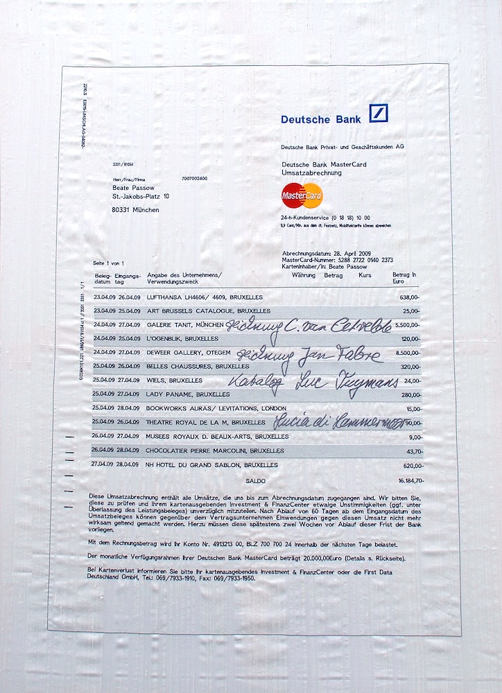170.510,33.- Es ist nicht ganz billig, sich ein Jahr lang in der Welt des Kunstbusiness zu bewegen. Addiert man die Beträge, die Beate Passow zwischen Oktober 2008 und Dezember 2009 bei einer Reihe wichtiger Messen und Ausstellungen der globalisierten Kunstwelt zahlte, kommt man auf die Summe von EUR 170.510,33.- Sie ergibt sich aus neun Kontoauszügen, die neben Reisekosten und Eintritten auflisten, in welchen Galerien Käufe getätigt und welche Orte der Kunstszene – von der Bar bis zum Friseur – aufgesucht wurden. So entsteht das Bild einer Person, die sich im Lifestyle des Kunsttourismus gut auskennt, die aber sicher noch zu den bescheideneren Vertreterinnen der 'artworld' gehört. So kauft sie nur Zeichnungen und kleinere Arbeiten, fliegt Economy, übernachtet nicht in den teuersten Hotels, geht während eines drei oder viertägigen Aufenthalts höchstens einmal in die Oper oder ins Theater und besitzt offenbar keinen Modefimmel, der sie zur Stammkundin in Boutiquen werden ließe. Nicht wenige, die denselben Parcours an Kunstevents – von der FIAC in Paris über die Biennale in Venedig bis zur Art Basel Miami Beach – absolvieren, dürften also drei-, fünf-, zehn-, gar zwanzigmal mehr ausgeben als hundertsiebzigtausend Euro.