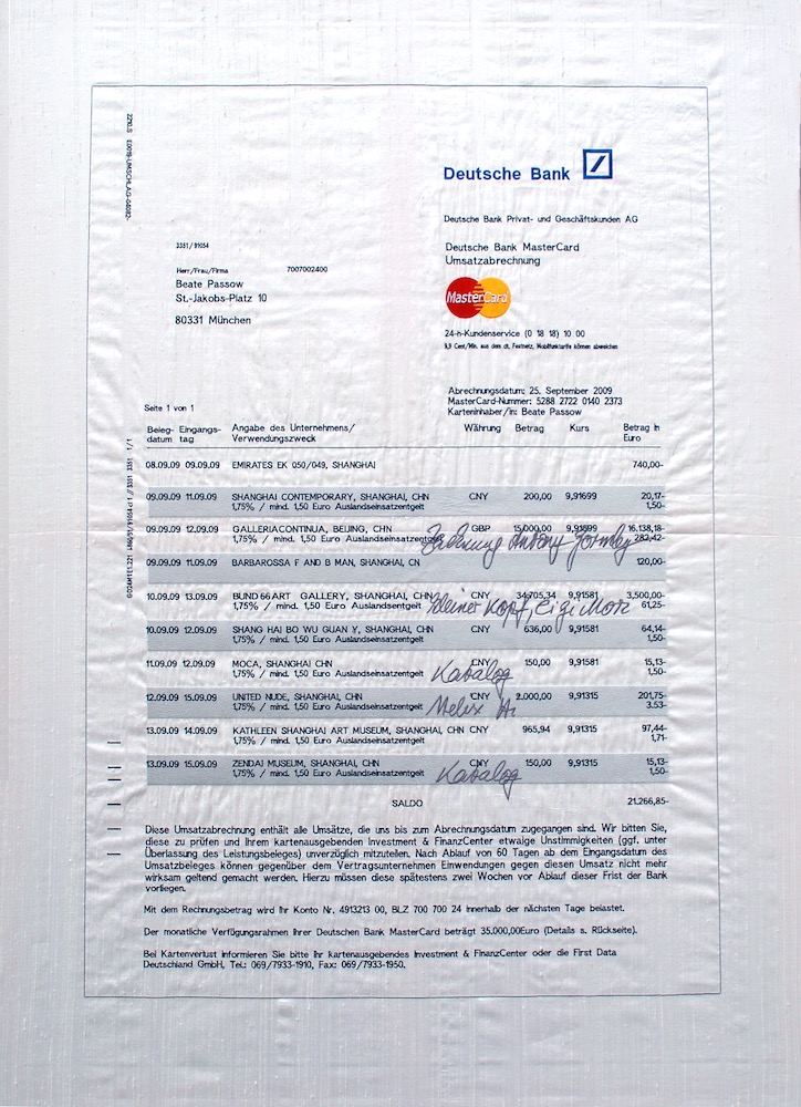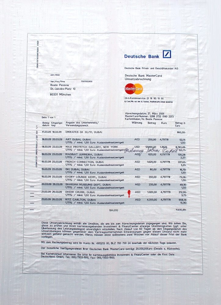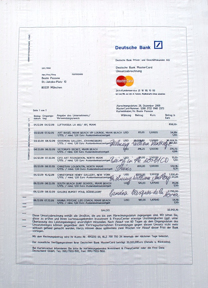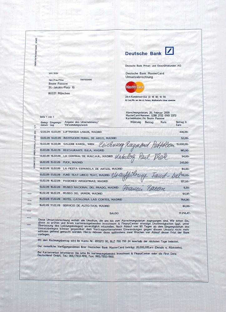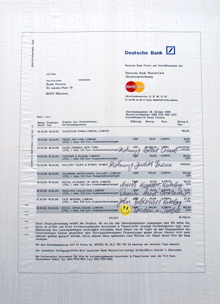 Eine Serie von neun Bildern die auf Seide gestickt wurden. Die Bilder zeigen Kreditkartenauszüge der Deutschen Bank. Die Protagonistin reist auf neun Kunstmessen um eine Sammlung von zeitgenössischen Zeichnungen anzulegen. An Hand der Auszüge kann man die Käufe sowie das kulturelle Angebot der jeweiligen Messestädte nachvollziehen. Sie war auf der Art Miami, Frieze London, Artforum Berlin, Shanghai Contemporary, Art Basel, Art Dubai, Art Brüssel, Arco Madrid und der Fiac Paris. Die Kreditkartenauszüge ergeben das Portrait einer Kunstsammlerin, die sich immer mehr traut bei ihren Ankäufen, gleichzeitig spiegeln sie den Hintergrund einer bestimmten Käuferschicht des Jahres 2009.